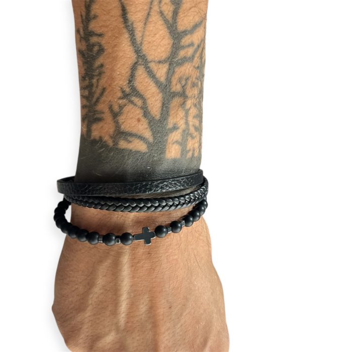 Ανδρικό δερμάτινο βραχιόλι 3 σε 1 μαύρο