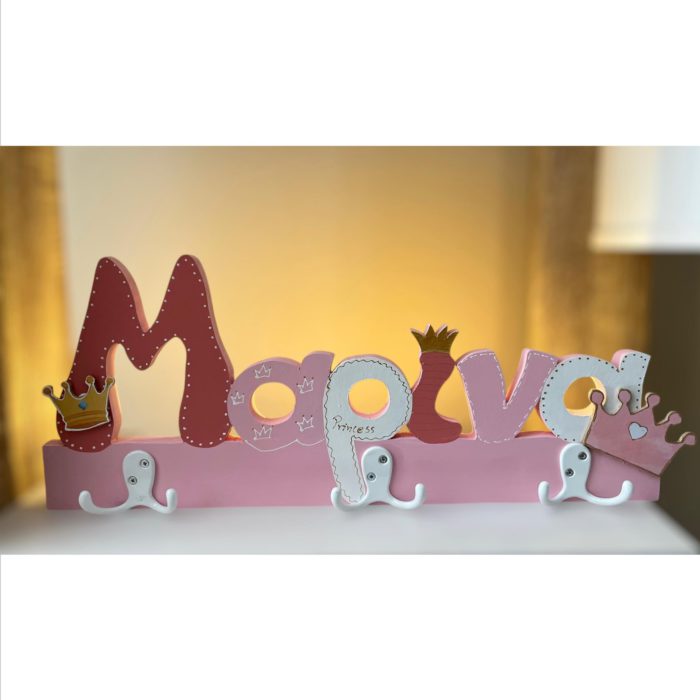 Χειροποίητη ξύλινη κρεμάστρα με “Όνομα” ζωγραφισμένη στο χέρι σε χοντρό ξύλο. Την σχεδιάζουμε στο όνομα και στα χρώματα που επιθυμείτε. Η διάσταση και η τιμή διαμορφώνονται ανάλογα τα γράμματα.