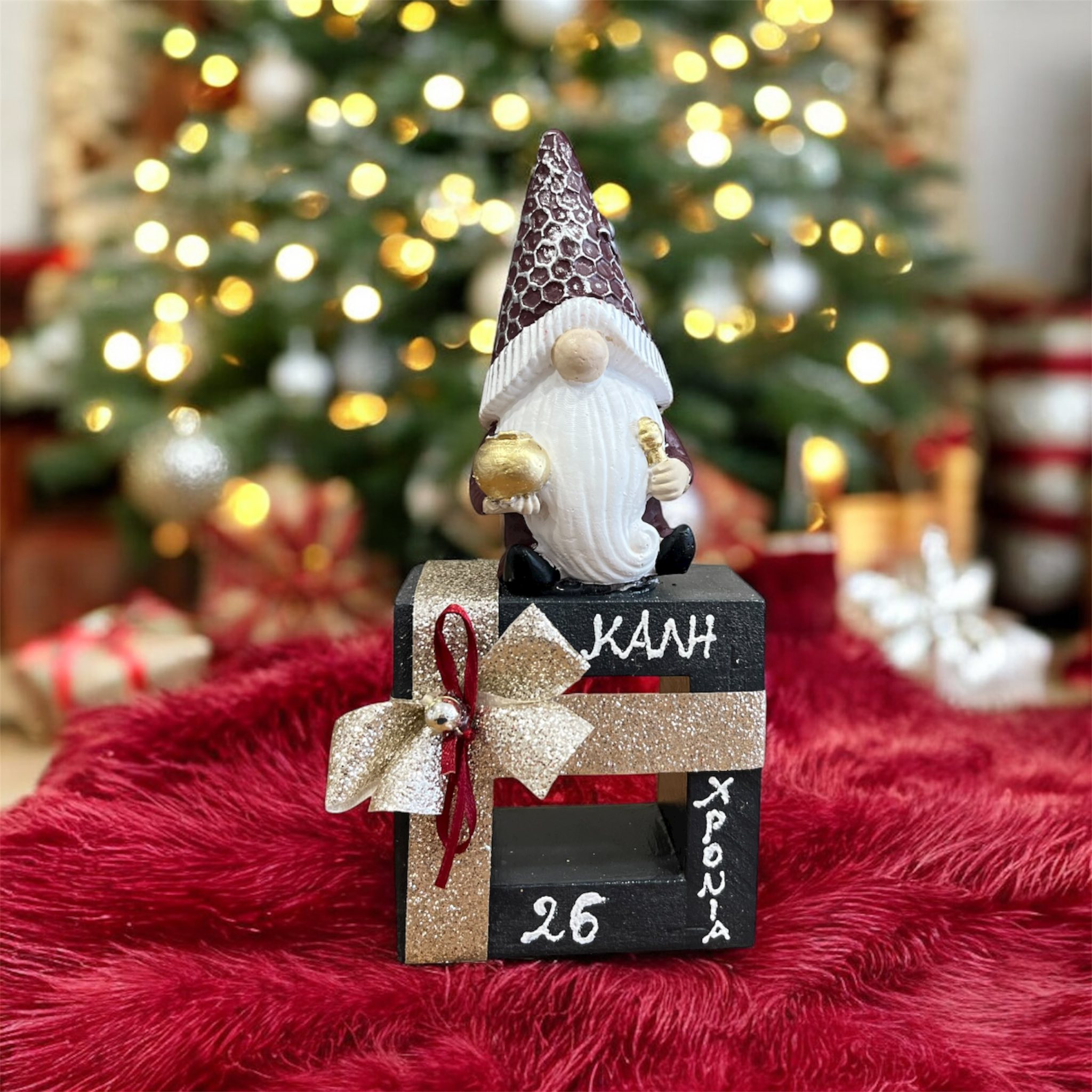 Η κατασκευή του εγγυάται αντοχή και διάρκεια. Περιλαμβάνει ένα διακοσμητικό κεραμικό Άγιο Βασίλη που προσδίδει γιορτινή διάθεση, ιδανικό για το πνεύμα των Χριστουγέννων. Συνδυάζεται αρμονικά με τις κόκκινες και χρυσές χριστουγεννιάτικες κορδέλες, δημιουργώντας μια ζεστή ατμόσφαιρα. Προσθέτει μια παιχνιδιάρικη και παραδοσιακή χριστουγεννιάτικη πινελιά.