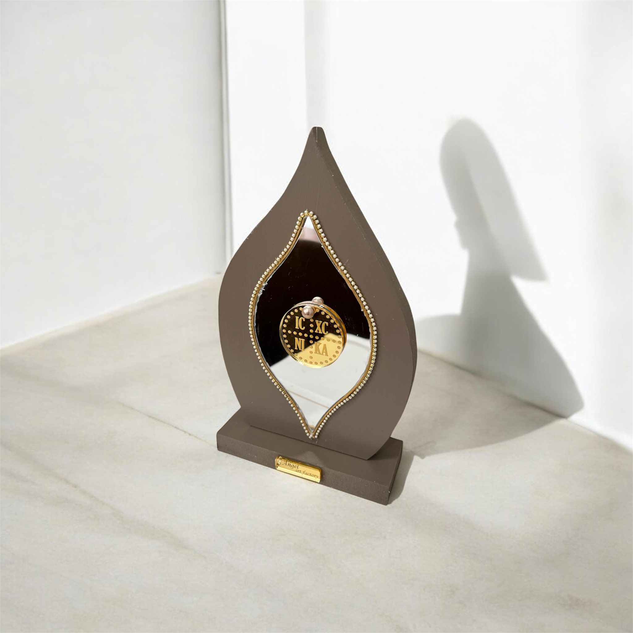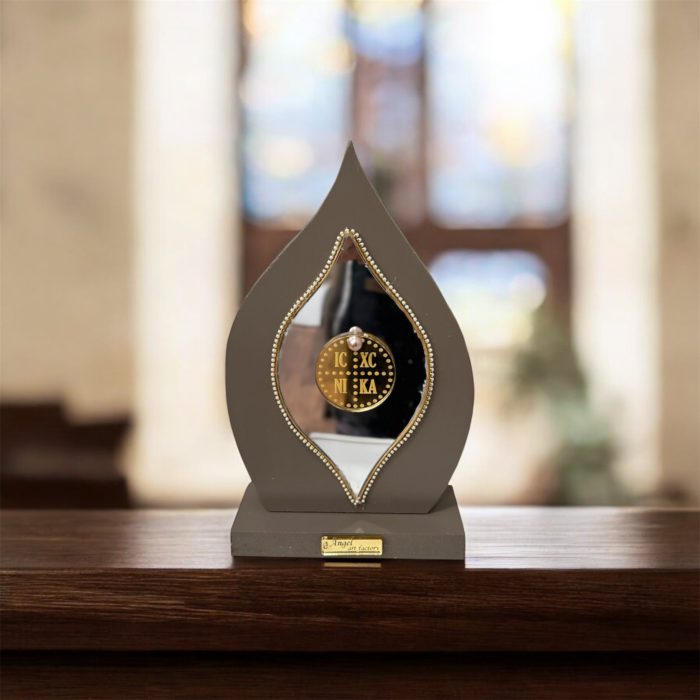 Η κομψή του φόρμα σε σχήμα φλόγας πλαισιώνει έναν καθρέφτη που αντανακλά το φως, ενώ το χρυσό σύμβολο “IC XC NIKA” προσθέτει ιερή δύναμη και συμβολισμό νίκης και προστασίας.