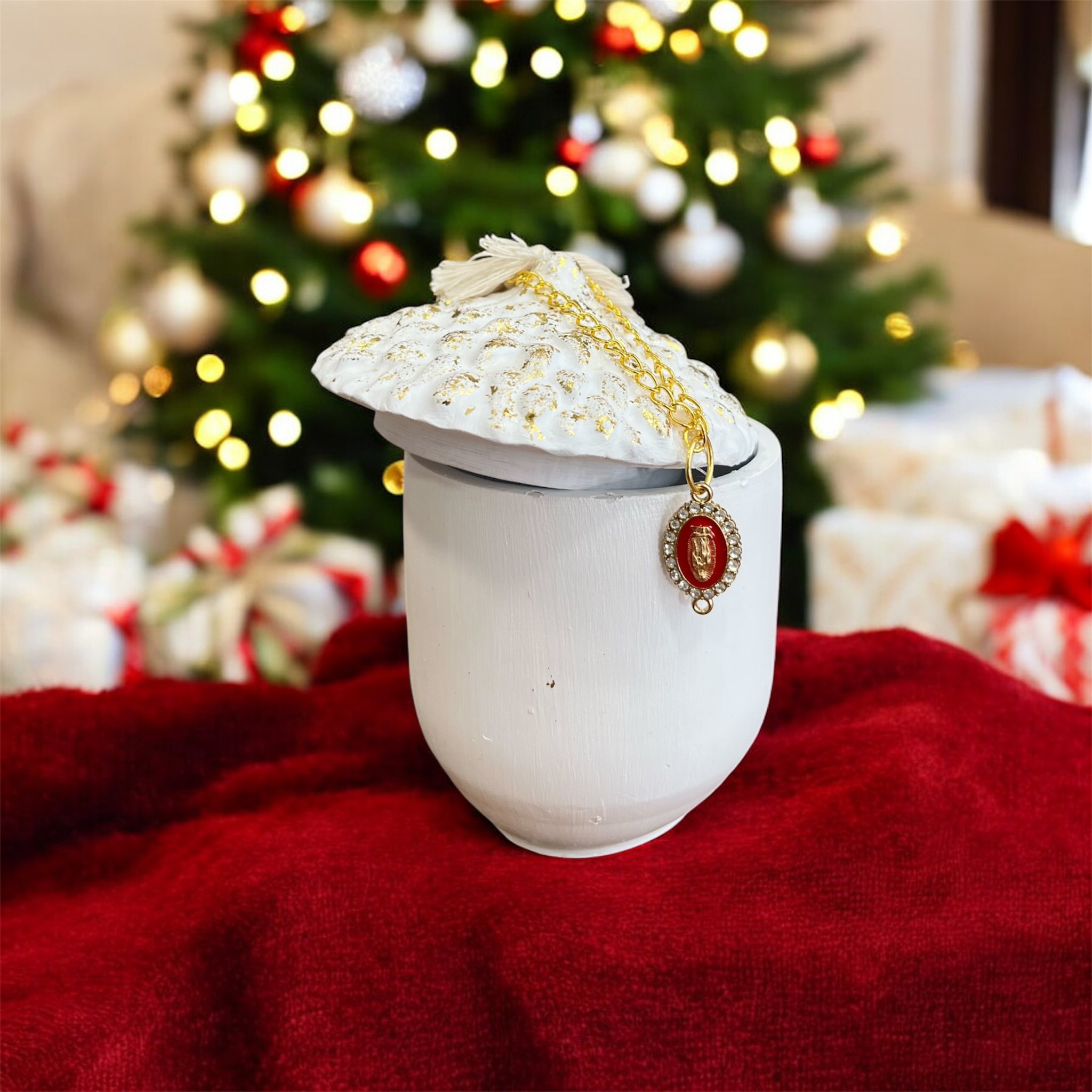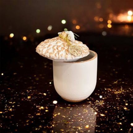 Ανανεώστε τη διακόσμηση του χώρου σας με αυτό το μοναδικό κεραμικό γούρι σε σχήμα βελανίδι, χειροποίητα διακοσμημένο με ιδιαίτερη τεχνοτροπία και χρυσές πινελιές που χαρίζουν πολυτέλεια και λάμψη. Το καπάκι του διαθέτει λεπτή υφασμάτινη φουντίτσα, ενώ μια χρυσή αλυσίδα με κρεμαστό μεταλλικό στοιχείο προσθέτει κομψότητα και συμβολισμό, κάνοντάς το ιδανικό δώρο για καλή τύχη και ευημερία.