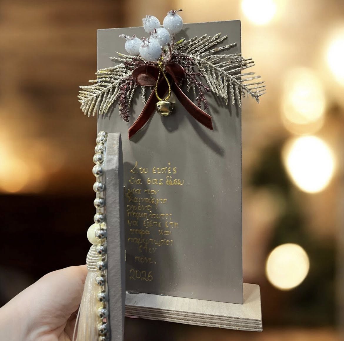 Το βελούδινο φιογκάκι και το χρυσό καμπανάκι στο κέντρο δίνουν μια ρετρό αλλά κομψή νότα. Η ευχή που περιλαμβάνεται είναι τυπωμένη με διακριτικό στυλ, ώστε να προσδίδει διαχρονική αξία στο διακοσμητικό. Το μήνυμα της υγείας, χαράς και αγάπης το καθιστά ιδανικό ως δώρο για φίλους και οικογένεια, στέλνοντας θερμές ευχές για το νέο έτος.