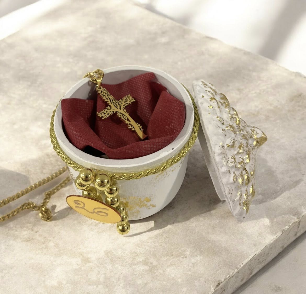 Τα χρυσά στοιχεία – κορδόνι, μεταλλικές χάντρες και διακοσμητικό φυλαχτό – δίνουν στο αντικείμενο μια ζεστή λάμψη, κάνοντάς το ιδανικό για δώρα, γιορτές αλλά και elegant διακόσμηση σπιτιού ή επαγγελματικού χώρου.