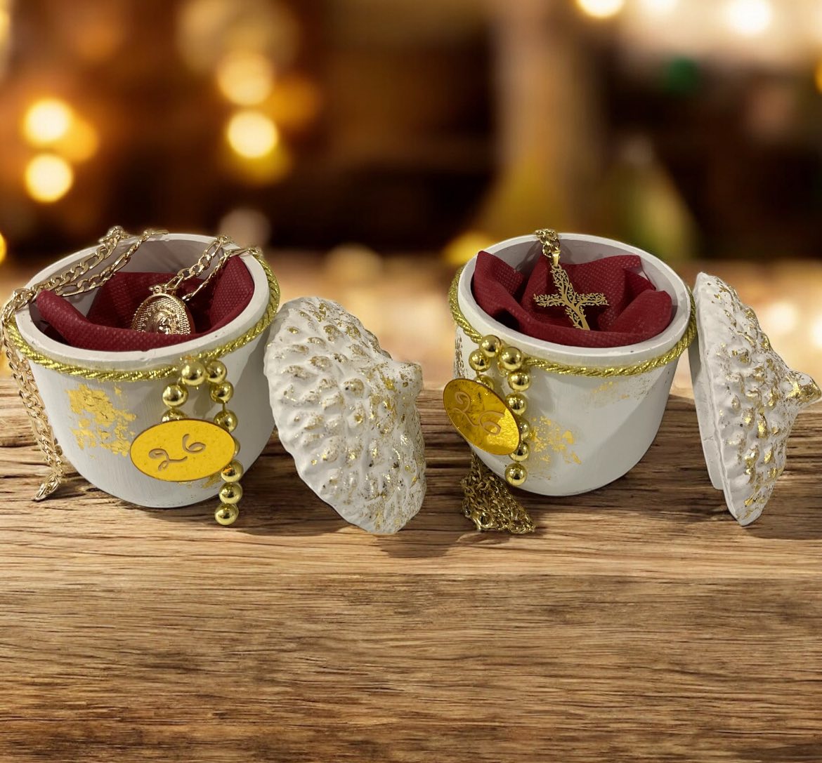 Ανακαλύψτε τα μοναδικά κεραμικά βελανίδια με καπάκι, ένα χειροποίητο διακοσμητικό που συνδυάζει κομψότητα, λειτουργικότητα και υψηλή αισθητική. Κάθε βελανίδι είναι προσεκτικά κατασκευασμένο από ποιοτικό κεραμικό υλικό, διακοσμημένο με χρυσές λεπτομέρειες και ανάγλυφο φινίρισμα στο καπάκι, προσφέροντας μια αίσθηση πολυτέλειας που δεν περνά απαρατήρητη.