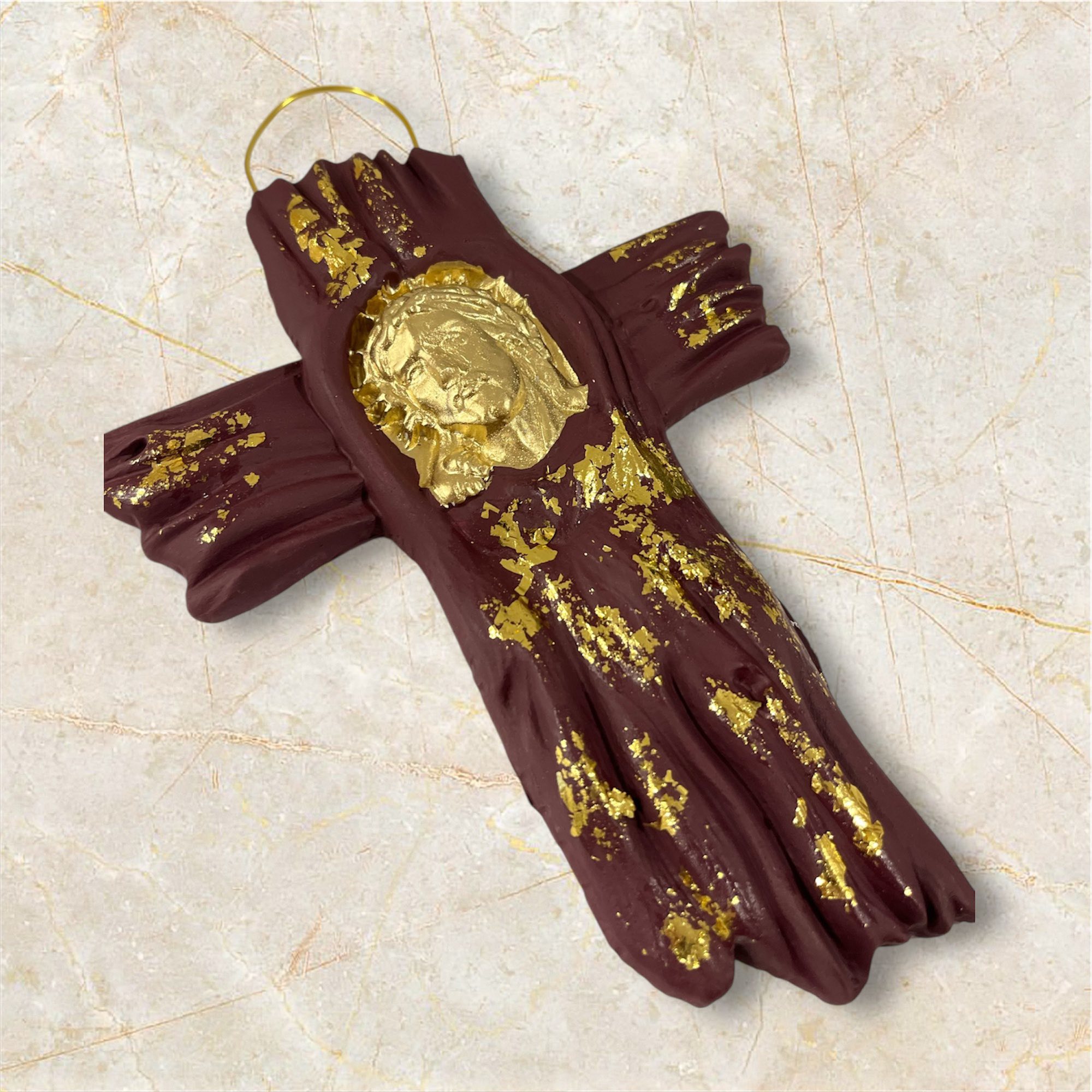 Εντυπωσιακός σταυρός από πορσελάνη σε βαθύ μπορντό χρώμα, με ανάγλυφη απεικόνιση του Ιησού και λεπτομέρειες από φύλλα χρυσού. Ιδανικός για διακόσμηση ή ως θρησκευτικό δώρο.