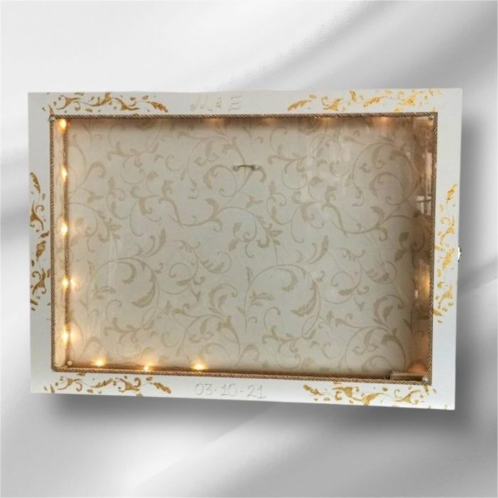 Ανακαλύψτε την απόλυτη τέχνη της παρουσίασης με την ξύλινη χειροποίητη στεφανοθήκη μας, η οποία διαθέτει ενσωματωμένο φωτισμό. Αυτή η μοναδική στεφανοθήκη δεν είναι απλώς μία βιτρίνα, αλλά ένα πραγματικό έργο τέχνης που θα αναδείξει τα πολύτιμα αντικείμενα του γάμου σας, προσφέροντάς τους τη θέση που τους αξίζει.