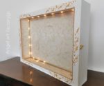 Ξύλινη χειροποίητη στεφανοθήκη με φωτισμό. Ένα έργο τέχνης για να πάρουν τα αντικείμενα του γάμου σας την θέση που τους αξίζει. Επικοινωνήστε μαζί μας για το ύφος και τα χρώματα που σας ταιριάζουν.