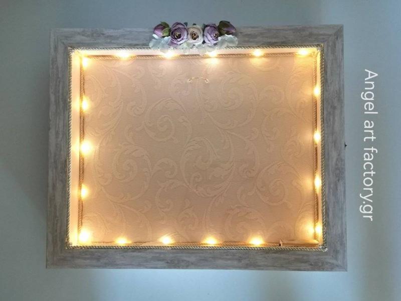 Ξύλινη χειροποίητη στεφανοθήκη με φωτισμό. Ένα έργο τέχνης για να πάρουν τα αντικείμενα του γάμου σας την θέση που τους αξίζει. Το εσωτερικό της είναι ντυμένο με δαντέλα, αν έχει εξαντληθεί η συγκεκριμένη το αντικαθιστούμε με παρόμοιο ύφασμα χωρίς να αλλάζει το τελικό αποτέλεσμα. Επικοινωνήστε μαζί μας για το ύφος και τα χρώματα που σας ταιριάζουν.