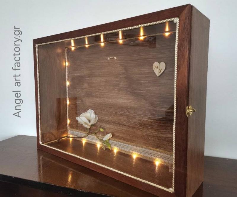Για μια μοναδική και ιδιαίτερη εμπειρία, επιλέξτε την ξύλινη χειροποίητη στεφανοθήκη με φωτισμό — το τέλειο έργο τέχνης για να κρατήσετε ζωντανές τις αναμνήσεις της ημέρας σας!