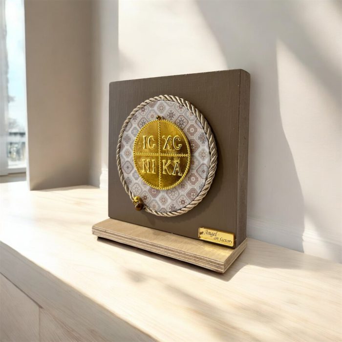Η ξύλινη πλακέτα σε βάση, διακοσμημένη με λαμπερό Κωνσταντινάτο, είναι ένα μοναδικό δώρο που μεταφέρει ευχές για προστασία, τύχη και ευλογία στο νέο ξεκίνημα ενός μικρού παιδιού.